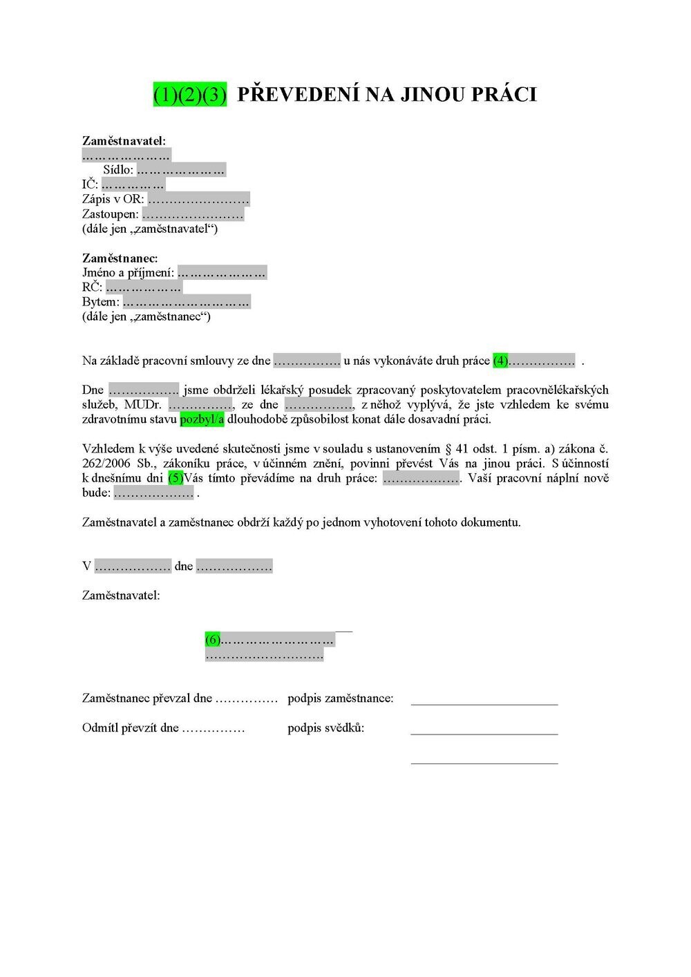 Tento vzor upravuje převedení na jinou práci z důvodu pozbytí zdravotní způsobilosti pro konání dosavadní práce.
